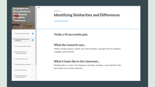 Hi there, I’m Jenny Malloy and this is Strategies for ELL Learners in the General Education Classroom. I designed and developed this asynchronous eLearning course using Articulate RISE 360. It was designed for K-12 school teachers and was intended to inform the learner about high yield teaching strategies based on the book Classroom Instruction that Works: Research-based Strategies for Increasing Student Achievement by Robert Marzano.